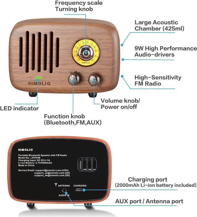 Long Playtime -- Built-in rechargeable 2000mA Li-ion battery supports up to 10 hours of wireless / AUX playtime or 20 hours of FM listening time (varies by volume level and content), and the convenience of being able to charge from most USB power sources adds onto its advantages.