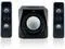 3 speakers: left, right, and subwoofer with wooden speaker enclosure