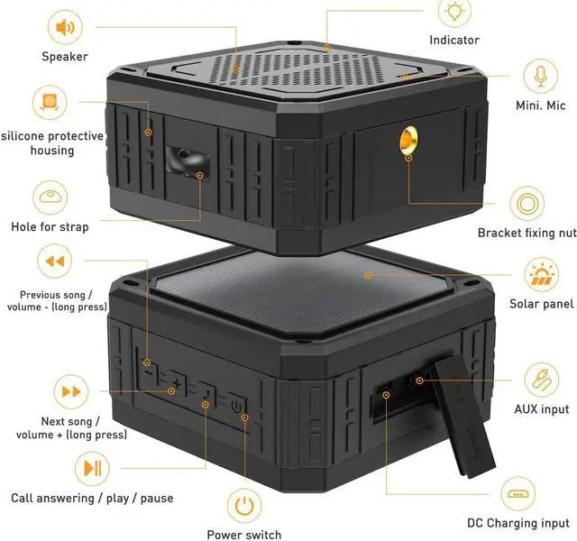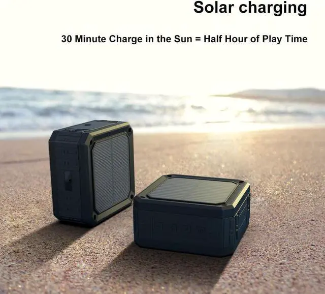 Solar Waterproof Bluetooth SpeakerThis rugged solar speaker uses ABS+environmental silica gel, Fully sealed design. silica gel in a highly elastic material, very durable. IPX6 waterproof/shockproof/dustproof, suits for pool, beach, shower etc outdoor activities. Even drops from high place, still maintains original.