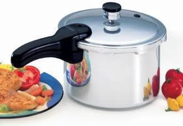 The smart choice for preparing todays lower calorie foods. Cooks three to ten times faster than ordinary cooking methods! Saves times, energy, and money. Ideal for use on regular and smooth-top ranges. Strong, heavy-gauge aluminum for quick, even heating, easy cleaning, and long life. Pressure cooking preserves flavors and nutrients, and even tenderizes lean cuts of meat.. Pressure regulator maintains the proper cooking pressure automatically. Ideal for use on regular and smooth-top ranges. Strong, heavy-gauge aluminum for quick, even heating, easy cleaning, and long life. Cover lock indicator shows at a glance if there is pressure inside the cooker. Includes cooking rack and complete 64-page instruction/recipe book. 4-Quart Liquid Capacity (3.8 liters).