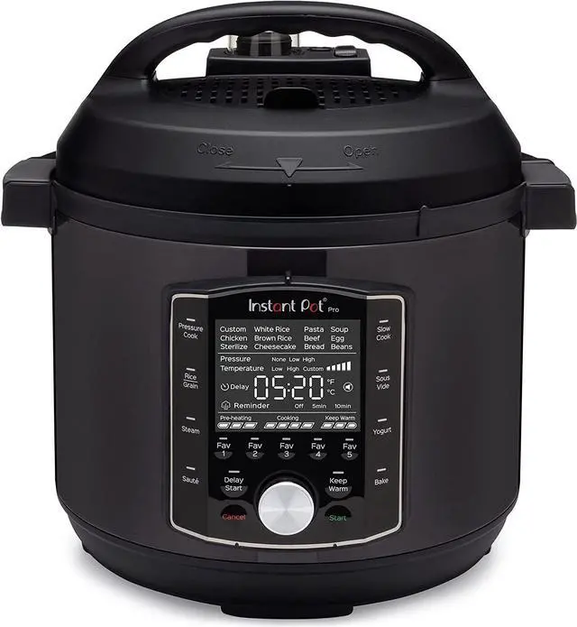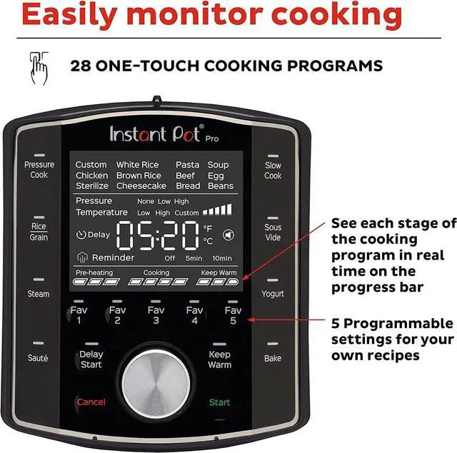 It replaces 10 kitchen appliances: slow cooker, pressure cooker, sous vide, sauté pan, sterilizer, yogurt maker, food warmer, cake baker and steamer. The upgraded gentle steam release is quieter and less messy with the diffusing cover. And the Pro is filled with thoughtful extras like Easy Grip handles on the inner pot, a large LCD display thats easy to read, and an auto-sealing lid. The Instant Pot Pro offers the quality, convenience and versatility youve come to expect from Instant discover amazing. Built-in safety features include Overheat Protection, safety lid lock and quick release button for worry-free cooking. And youll always know what your Instant Pot is doing, as it features an intuitive cooking progress bar that shows you every step, from preheating, to cooking, to keep warm, so youre never left guessing. The upgraded inner pot is made from premium quality 304 grade (18/8) stainless-steel and features silicone handles for easy gripping, as well as a flat, tri-ply bottom for the ultimate searing and sautéing. The new gentle steam release diffusing cover reduces noise and prevents countertop splash.