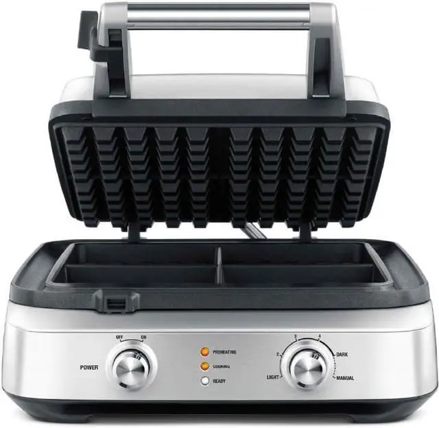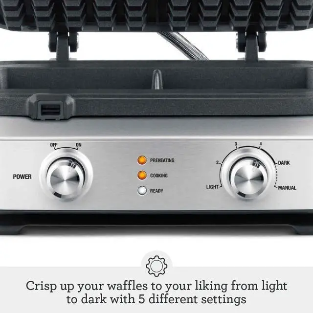 The Breville Smart Waffle 4 Slice waffle maker automatically calculates the correct cooking time for any waffle style; Crisp your waffles using 12 different settings and monitor your cooking with the progress bar on the LCD display