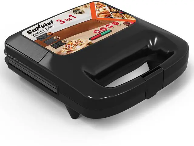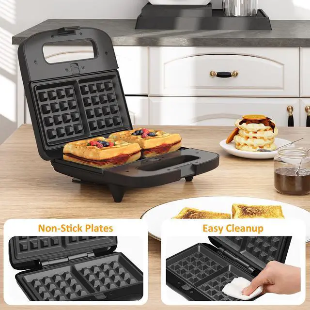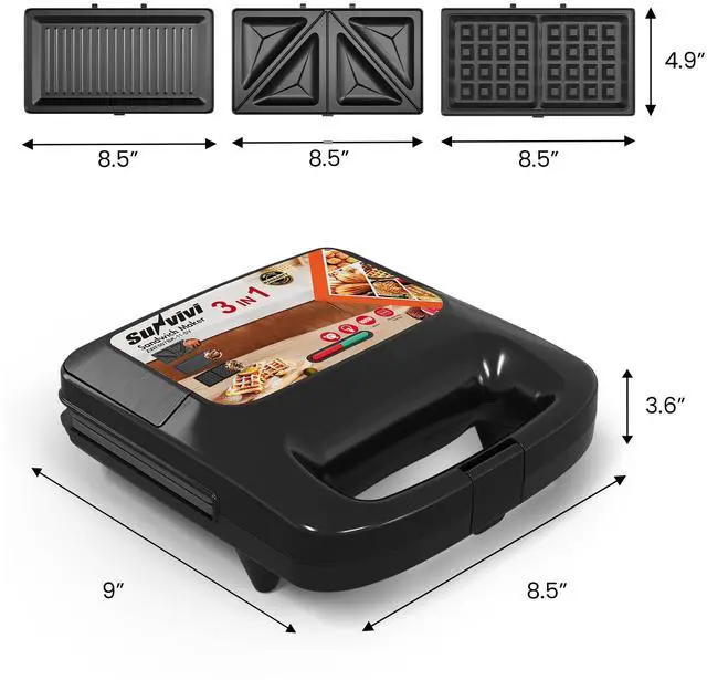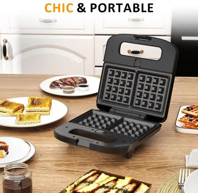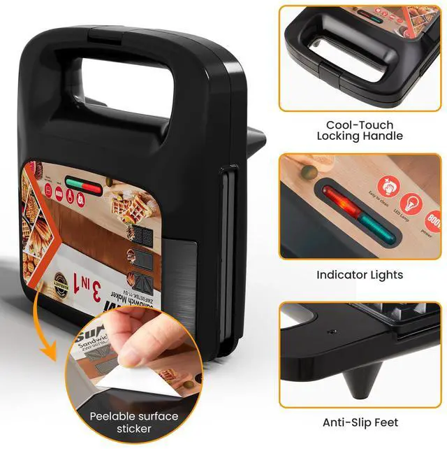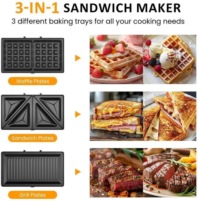 Transform your mornings with the 3-in-1 sandwich makerdesigned to create your favorite breakfast treats in no time. With three versatile plates, you can easily whip up everything from crispy waffles to grilled steaks or mouthwatering sandwiches. Powered by 800W, it heats quickly, so youll have your meal ready in minutes, even on the busiest days. The non-stick plates make cleanup a breeze, while the cool-touch handle and indicator lights ensure safe, hassle-free cooking. Compact and lightweight, its perfect for on-the-go meals, travel, or as a thoughtful gift. Backed by a 1-year warranty and UL/ETL certification, it promises reliable quality for your kitchen adventures.