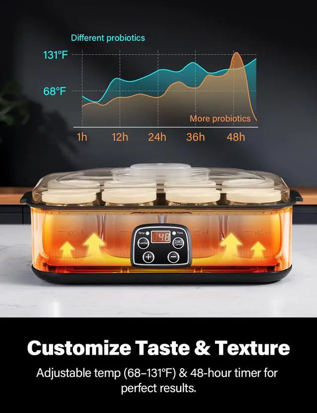 Create Your Ideal Yogurt Texture & Taste: Fine-tune fermentation with adjustable temperature (68131°F) and up to 48-hour timer, suitable for home kitchens and overnight yogurt making with customized thickness and tanginess.