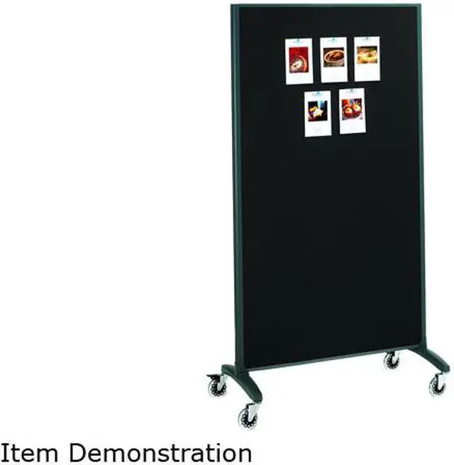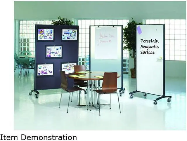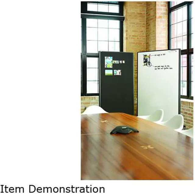 Two-sided rolling room divider features a premium porcelain magnetic whiteboard with flip chart pad holders on one side and fabric-covered bulletin board. Perfect tool for presentations and meetings. Durable fabric bulletin surface allows you to display items. String boards together to act as a room divider. Boards nest together for storage. Design offers a graphite metal frame, sleek narrow footprint and easy mobility with four wheels. Room divider includes four Quartet markers, eraser and attachable magnetic marker tray.