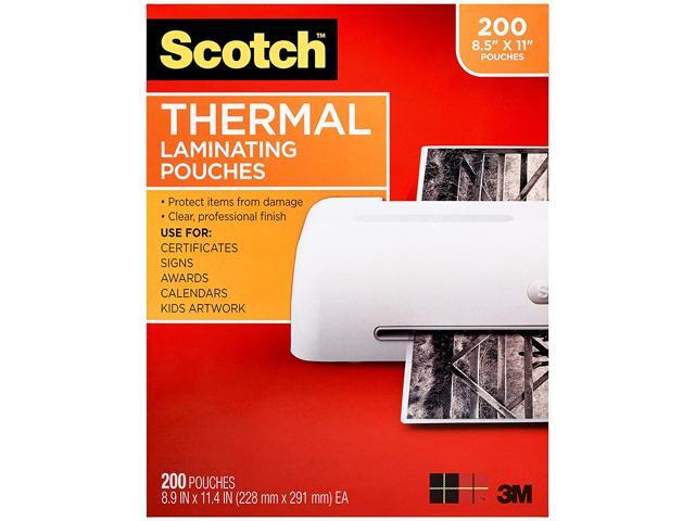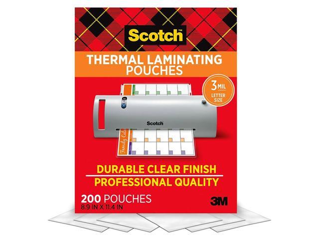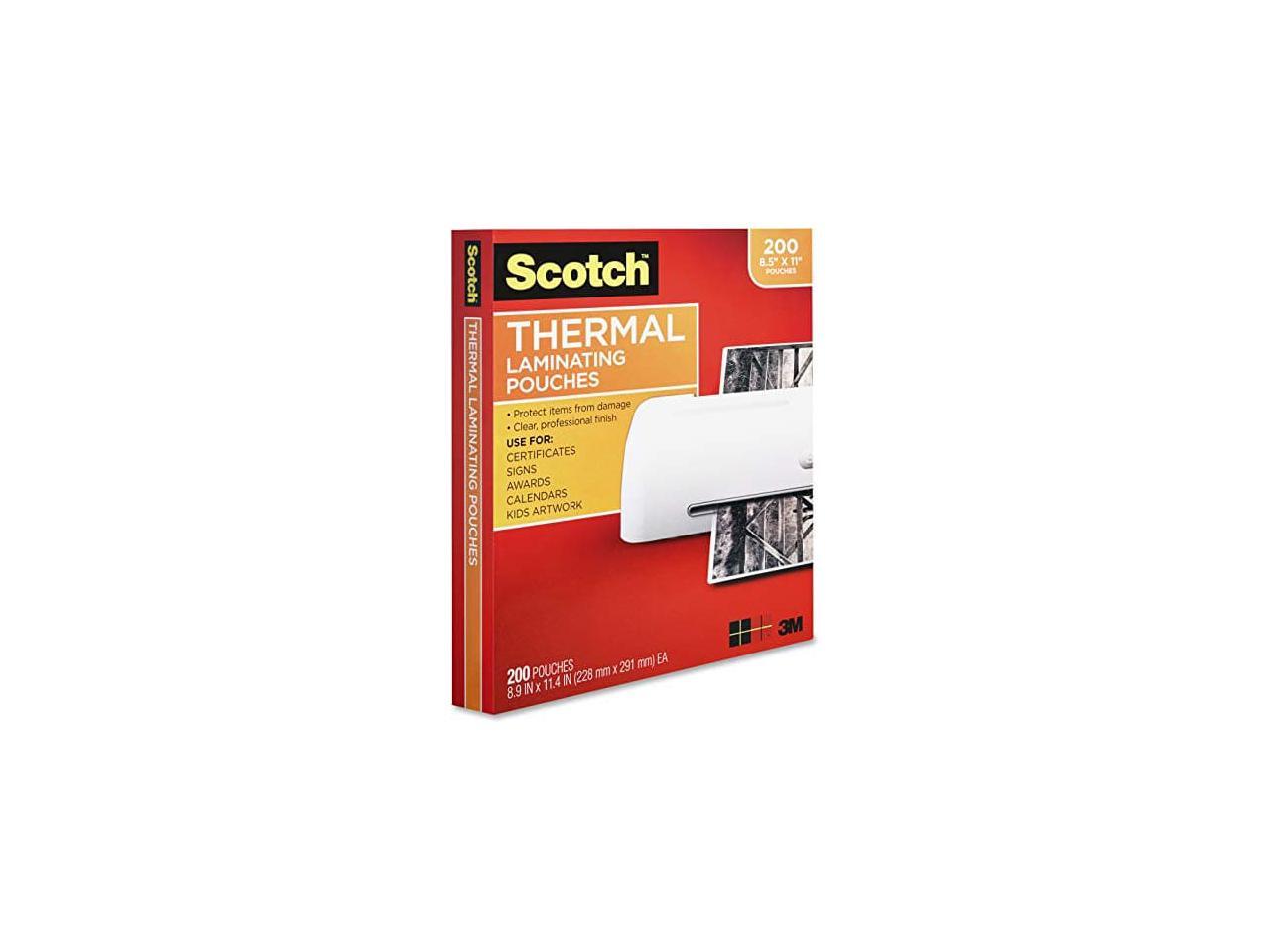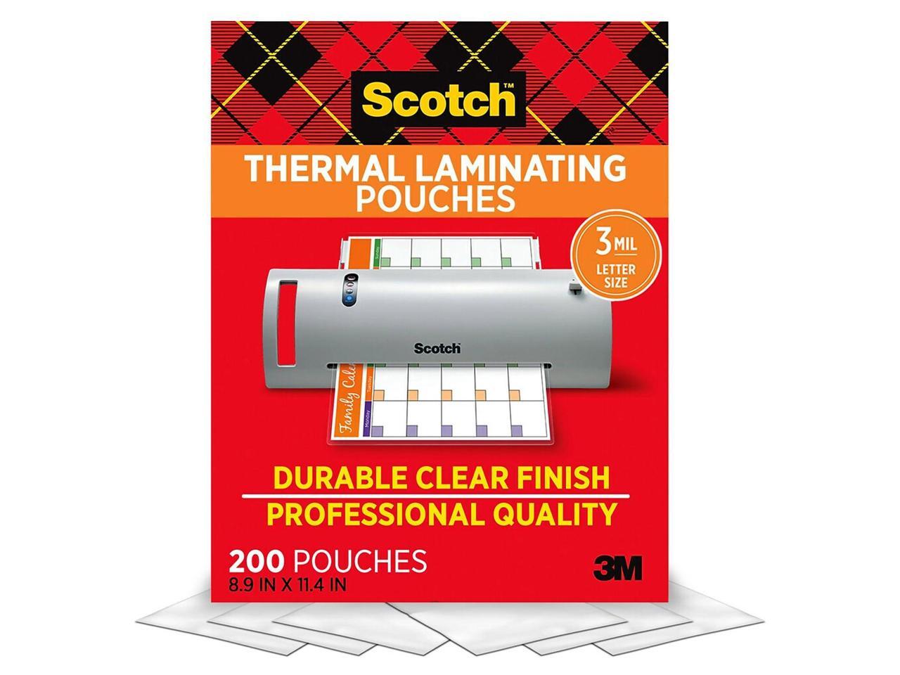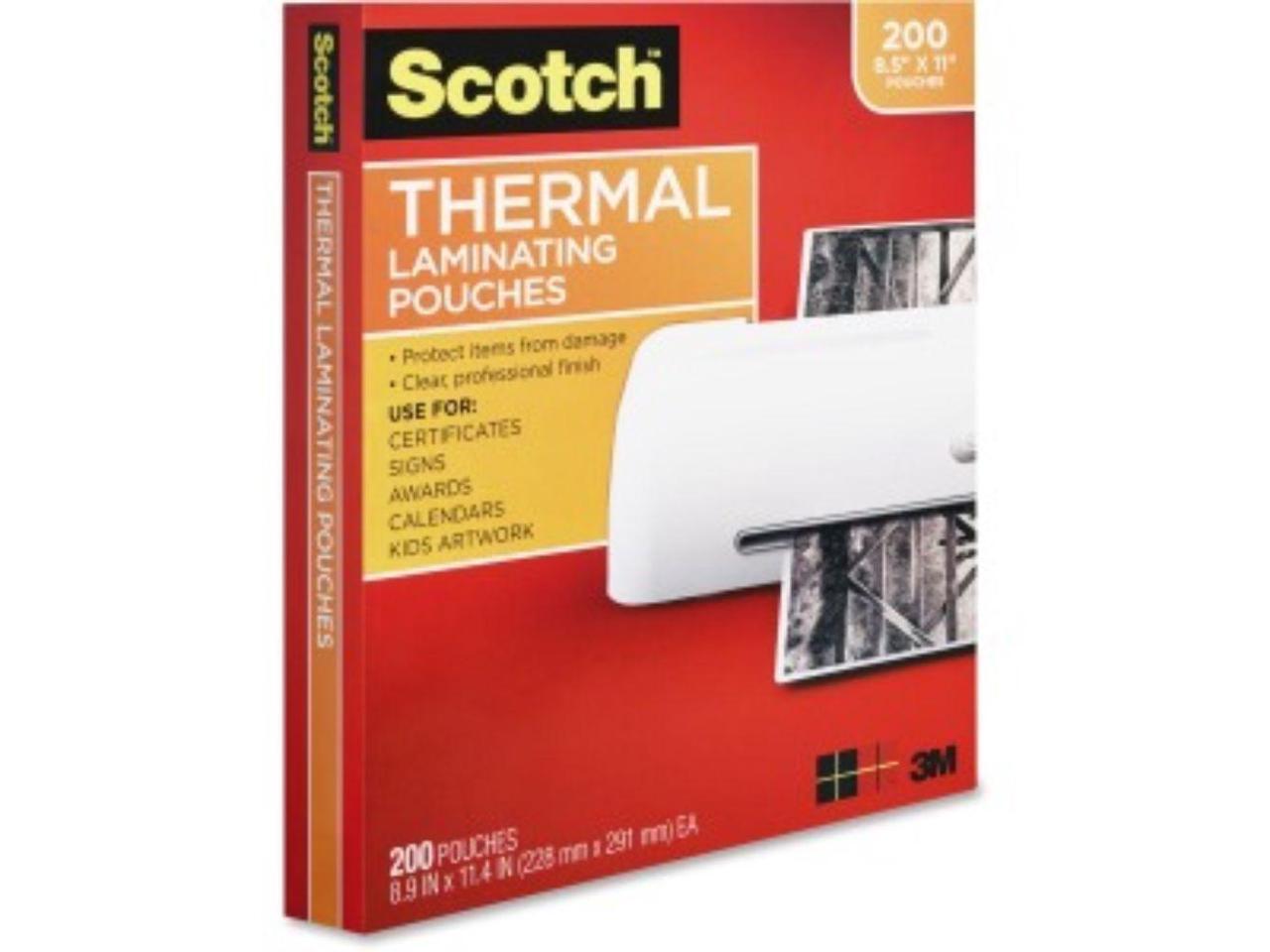 - THERMAL LAMINATING POUCHES: One 200-count package of Scotch Thermal Laminating Pouches, ultra-clear pouches that protect and add professionalism to documents you use frequently. CLEAN POUCHES: Most household cleaners are safe to use on these laminator pouches, so you can easily disinfect them.