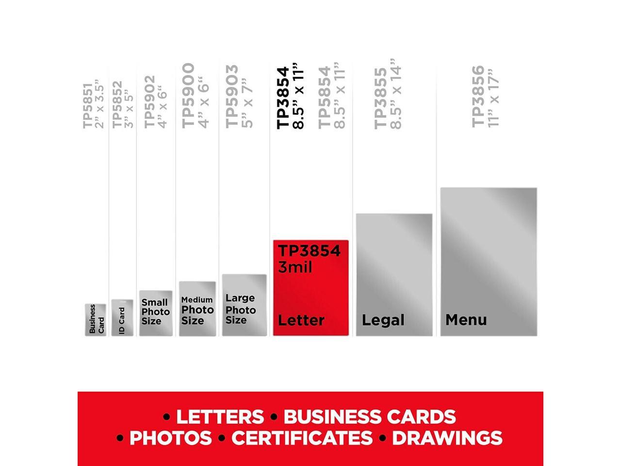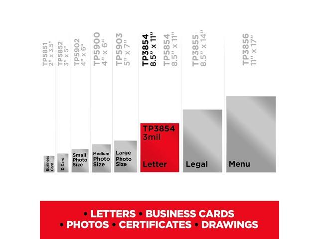 - FINISH: These laminate pouches achieve a clear, photo-safe finish. FITS LETTER-SIZE POUCHES: One package contains letter-size pouches that fit items up to 8.9 in. x 11.4 in.