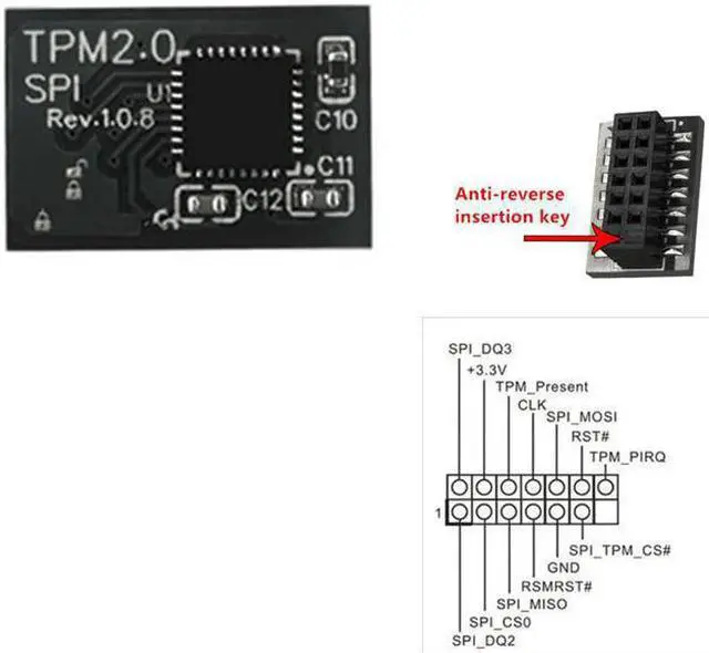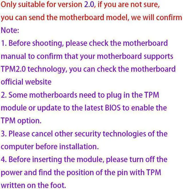 Module Note: Please note these are not universal, please check the module required by your particular motherboard. Please also note that not all motherboards can support TPM 2.0 Before you take the order, please check the motherboard manual to confirm that your motherboard supports TPM 2.0 technology. You can check or consult on the motherboard's official website. Some motherboards need to plug in the TPM module or update to the latest BIOS to enable the TPM option. Please cancel other computer security technologies before installation.