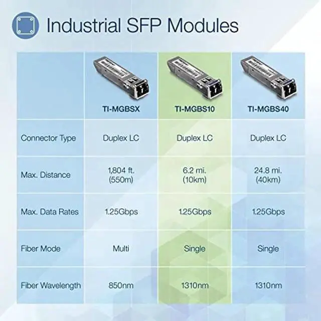The 1000Base-LX Industrial SFP Single-Mode LC Module, model TI-MGBS10, is designed to operate within a wide temperature range and is well suited for industrial environments. This SFP module works with standard SFP slots found on industrial switches and fiber converters. The TI-MGBS10 is compatible with Duplex LC fiber connector types and supports gigabit single-mode fiber connections at distances of up to 10 kilometers ( 6.2 miles).