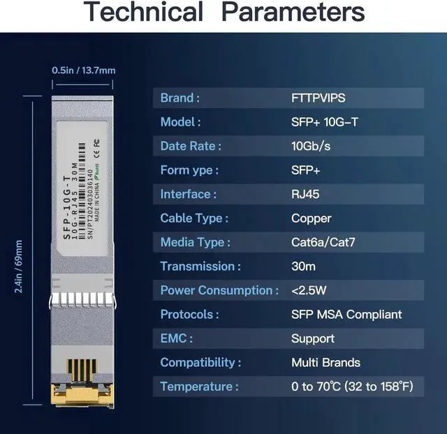 Enhance your network's performance and reliability with this high-quality 10GBase-T SFP+ RJ45 Copper Transceiver Module, designed for easy integration and exceptional compatibility with your existing network infrastructure.