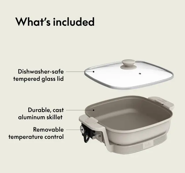 bella Make & Take Electric Skillet, Fits-anywhereTM kitchenware, EverGoodTM Ceramic Coating, Adjustable Temperature & Dishwasher-Safe Tempered Glass Lid, Cast Aluminum Base, 1200 Watt, Oatmilk
