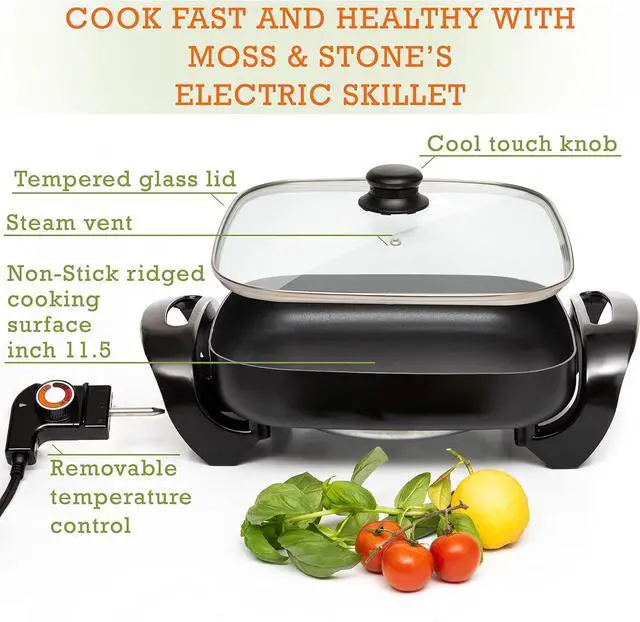 Special Housewarming Or Wedding Gift: Surprise your friends and relatives with the Moss & Stone professional-grade electric frying pan, which features an adjustable temperature controller from 200 to 425 degrees and a unique tilt leg that drains out the grease from your food as it cooks.