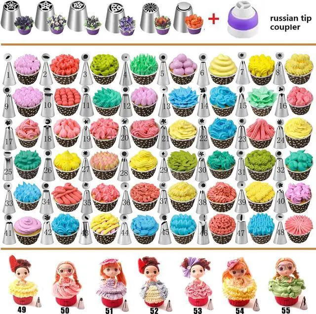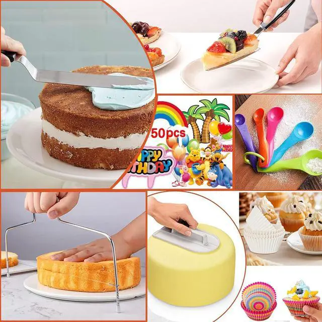 Incredible Cookie & Cake Decorating ToolsUnlock your cake decorating potential with this set of baking tools includes Cake Turntable Stand 55 Numbered Icing Tips 6 Flower Icing Tips4 Couplers Cake Server Straight & Offset Spatula Cake Leveler 3 Cake Scrapers 100 Disposable Icing Bags 4 Reusable Silicone Pastry Bag Flower Nail & Lifter Tips Cleaning Brush Fondant Smoother 8 Fondant Modeling Tools 40 ABC Plungers 200 Disposable cupcake liners