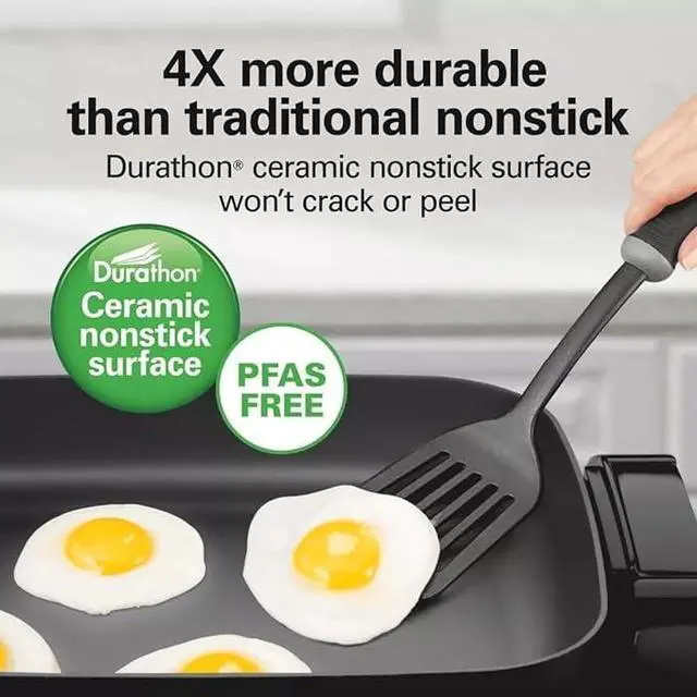 FOUR TIMES MORE DURABLE THAN TRADITIONAL NONSTICK AND PFAS FREE: The Durathon ceramic nonstick surface on this electric skillet is four times more durable than traditional nonstick and it wont crack or peel. Plus, it is PFAS free.