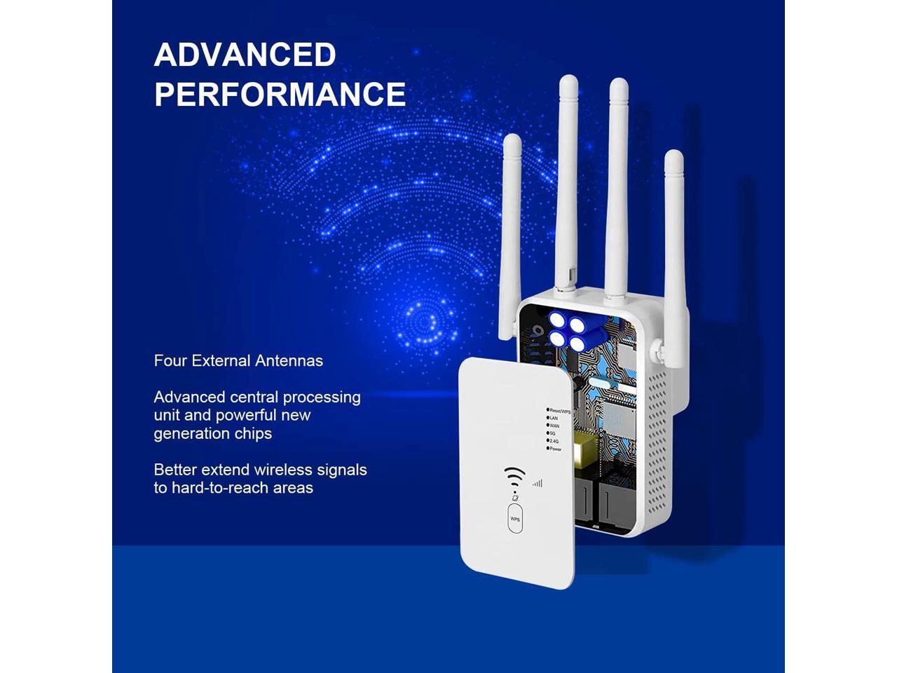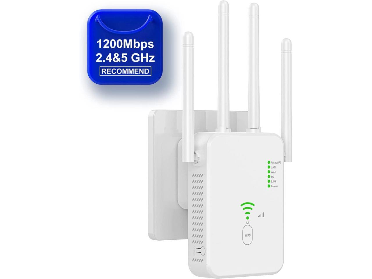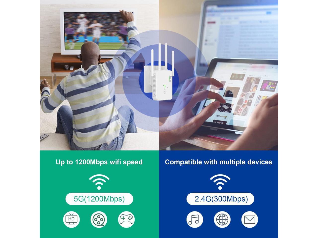 - [1200Mbps Dual Band Wireless WiFi Extender] The highest transmission rate of Wifi Repeater long range can be up to 1200Mbps(2.4g/300Mbps and 5G/867Mbps). Using the 5GHz channel for data transmission with low interference and excellent performance.