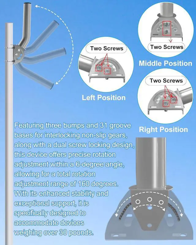Stability: Equipped with non-slip gears, the point-to-point wireless bridge pole mount ensures secure installation. Once the angle of the rod is adjusted, a light twist will firmly lock it in place. Additionally, two hoops securely fasten the mount to the rod, providing added stability and peace of mind.