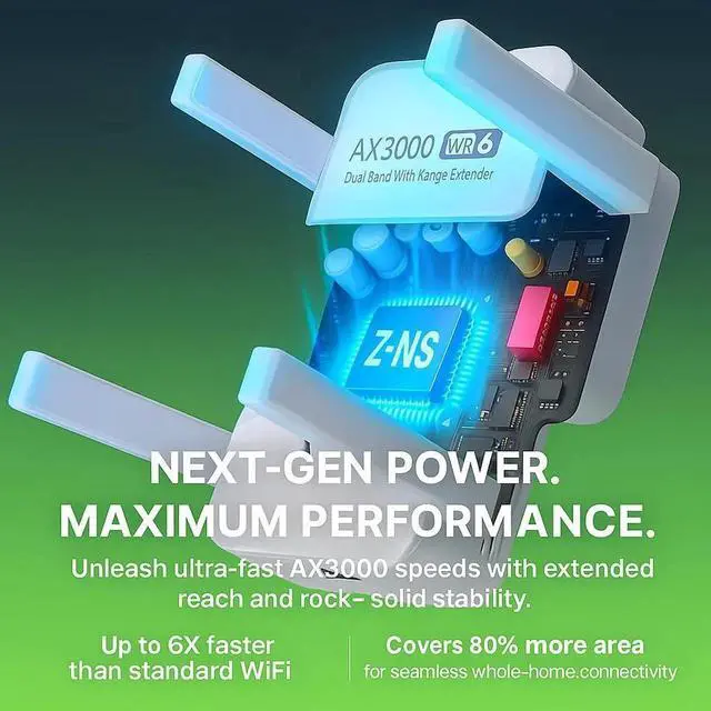 Up to 10, 000+ Sq. Ft Coverage, Eliminate Dead Zones, Penetrates Walls and Floors, Whole Home Coverage, No More WiFi Dead Zones, Stable Signal Through Obstacles, 360° Full Signal Coverage, Reaches Hard-to-Cover Areas, WiFi 6 Speeds Up to 3000Mbps, Dual-Band 5GHz & 2.4GH z, Ultra-Speed for Gaming and Streaming, AX3000 WiFi 6 Extender, Next-Gen WiFi 6 Technology, Smooth 8K Video Streaming, Supports 100+ Devices, Universal Compatibility, Works with All Routers and Devices, Compatible with Smart Home Devices, Connects Phones, Laptops, Gaming Consoles, and More, Supports Alexa, Ring, Fire Stick, PS5, and Xbox