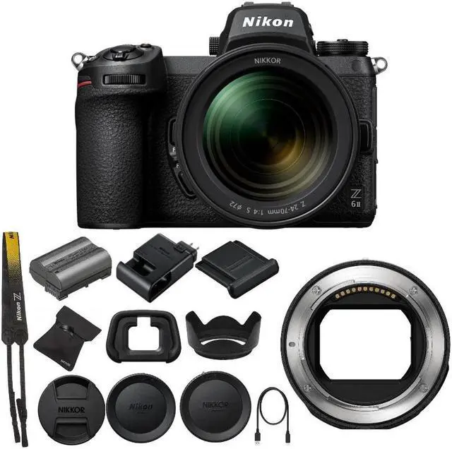 Nikon Z 6II FX-format Mirrorless Camera Body with NIKKOR Z 24-70mm f/4 S Lens Join the next generation of Z mirrorless and get ready to capture stunning images and video with the 24.5 MP Z 6II and NIKKOR Z 24-70mm f/4 S zoom lens. The lens features a constant f/4 maximum aperture and is designed to be shot wide-open with smooth, quiet focusing. This versatile lens is ideal for capturing wide views, close-ups and everything in between. The camera features 4K Ultra HD video at 60p, a 273-point Hybrid AF system with more options, outstanding low-light capabilities, dual processors, dual card slots, and wireless connectivity with smartphones and laptops.