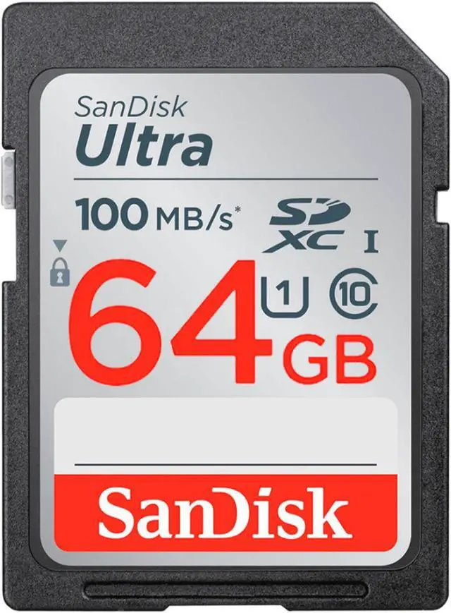 SanDisk 64GB Ultra SDXC UHS-I 100MB/s Memory CardStore lots of photos and Full HD videos and transfer them quickly to your computer using the SanDisk Ultra 64GB SDXC UHS-I Memory Card. Great for compact-to-midrange point-and-shoot digital cameras and camcorders, this memory card offers read speeds of up to 100MB/s that are twice as fast as ordinary SDHC cards, allowing you to take pictures and transfer files quickly. The SanDisk Ultra SDXC UHS-I Memory Card comes with 64GB of storage and is resistant to water, extreme temperatures, X-rays, and shocks. A label allows you to note what's on the card for easy identification.
