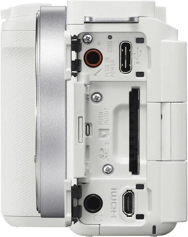 Ports on the ZV-E10 II include a micro-HDMI video output and USB-C data output, which can facilitate video sharing to a computer or compatible mobile device. You can even live stream to social media using the USB-C data port or integrated 5 GHz WiFi. The USB-C data port also supports high-speed wired transfers to a compatible device through the Sony Creators App. RTMP, RTMPS, and SRT streaming protocols are supported as well as UVC standards, which allow you to use the camera as a webcam.