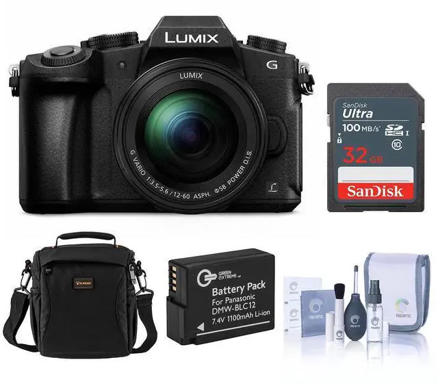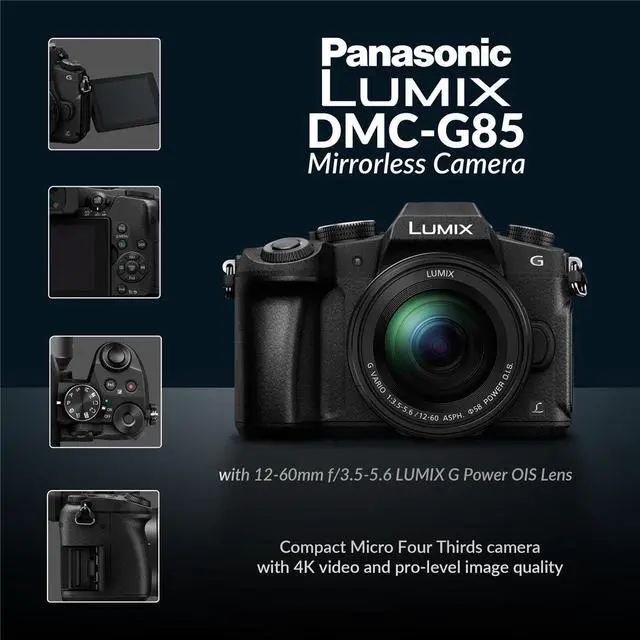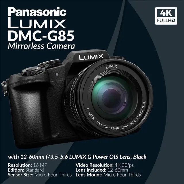 The Panasonic Lumix DMC-G85 mirrorless camera with a 12-60mm f/3.5-5.6 Lumix G OIS lens is a well-rounded bundle that includes essential accessories such as a charger, two battery packs, a body cap, shoe cover, cable, strap, memory card, shoulder bag, and a cleaning kit. At the heart of the camera is a 16MP Live MOS sensor, which delivers solid image quality with a good balance between resolution and performance in low-light conditions. Paired with the Venus Engine image processor, it ensures fast image processing, effective noise reduction, and smooth video capabilities. The camera features 5-axis Dual I.S., which combines in-body and lens-based stabilization for exceptional shake reduction in both photos and videos. Its dustproof and splashproof construction makes it suitable for shooting in challenging weather conditions. The G85 supports 4K UHD video recording up to 30p and Full HD 1080p recording at up to 60p, making it versatile for both casual and more advanced video work. The bundle also includes a compatible SDHC memory card that works well with various devices, and a shoulder bag featuring a top zippered pocket for quick access to small items like sunglasses or sunscreen. The included batteries are compatible with Panasonic Lumix cameras using the DMW-BLC12 battery model, ensuring broad usability across multiple devices