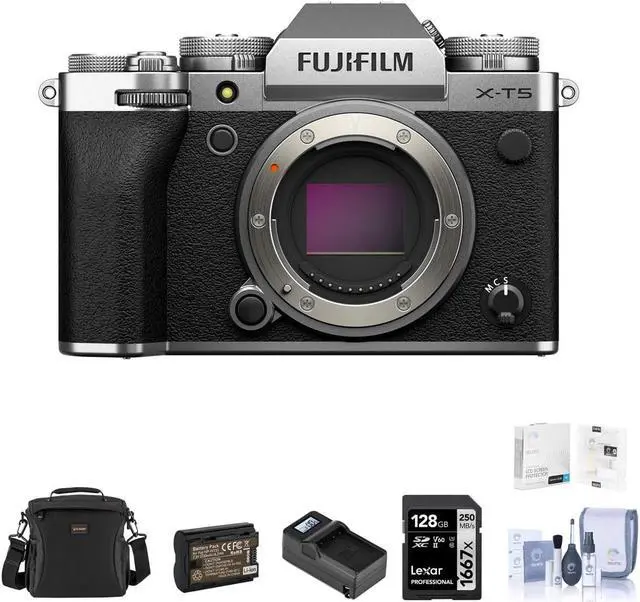 Fujifilm X-T5 Mirrorless Camera, Silver Bundle with 128GB SD Card, Shoulder Bag, Extra Battery, Charger, Screen Protector, Cleaning Kit