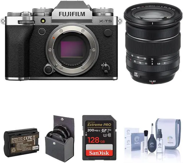 About The X-T5 Mirrorless Camera with XF 16-80mm f/4.0 R OIS WR Lens, Silver- X-T5 Mirrorless Camera -Photography FirstX-T1 was originally released in 2014 to celebrate Fujifilm's 80th anniversary. It would go on to lead a mirrorless camera revolution.Almost a decade and five generations later, Fujifilm's latest imaging technology has come to X-T5, bringing photographers unrivalled image quality in a timeless, classic, and beloved camera body.Five Generations of Technological Evolution 40MPFifth-generation X-Trans CMOS 5 HR sensor and X-Processor 5 bring the most advanced imaging technologies ever to X SeriesHigh Resolution 40.2MP BSI Imaging SensorThe high-resolution 40.2MP X-Trans CMOS 5 HR sensor has an enhanced image-processing algorithm that boosts resolution without compromising the signal-to-noise ratio, delivering astonishing image quality.Three top-plate dialsThree dials control ISO, shutter speed, and exposure compensation from the camera's top-plate. Together with the aperture ring on most XF lenses, all exposure settings can be checked and adjusted before powering on the camera. Create with confidence and concentrate on making an image.Lightweight, high performanceX-T5 features a five-axis in-body image stabilization (IBIS) system that provides up to 7.0 stops of compensation and a 3.69 million dot EVF with an 0.8x magnification ratio. Despite this, the camera body only weighs 557g (1.23lb). Dials and buttons provide easy operation, letting life's most precious moments stand a chance of being documented to see another day.Three-way tilting LCDA three-way tilting LCD offers enhanced versatility, particularly when working at waist level or in portrait orientation. The combination of tilting LCD and center viewfinder aligns the lens, camera, and photographer on the optical axis, for a more comfortable and intuitive image-making experience.Film Simulation19 Film Simulation modes inside of X-T5 digitally replicate the look of the classic photographic film stocks developed by Fujifilm for over 85 years. Reproduce the classic colors and tones that Fujifilm are known for, or add an artistic flair and start to Build Your Legacy.Classic chromeThis Film Simulation mode is designed to reproduce a look similar to documentary magazines of the 20th century. Its low-saturation and hard tonal gradation in shadows make it a perfect choice for documentary photography.Classic Neg.Based on SUPERIA, a color negative film loved by generations of photographers, this Film Simulation mode provides high-contrast tonal gradation. It adds depth and definition to colors by adjusting their shades in highlights and shadows, while reducing saturation.NOSTALGIC Neg.Designed to recreate the look of images in old photo albums, NOSTALGIC Neg. produces images with rich colors in the shadows and a soft tonality through the midtones and highlights.ACROSBased on ACROS, a monochrome film renowned for super-fine grain, this Film Simulation mode delivers rich shadow details and excellent sharpness, while still adding grain at high ISOs, and recreating the stunning textured feel of monochrome.ETERNA / CINEMABased on ETERNA, a film designed for motion pictures, this Film Simulation mode minimizes saturation to ensure no color overpowers another. It provides extremely soft tonal gradation in highlights, and deep shadows to prevent clipping, reproducing a cinematic look.White BalanceFine adjustments can be made to Auto White Balance (AWB) by selecting one of three modes: Auto, White Priority, and Ambience Priority. Set to White Priority, white is more likely to be reproduced as white under incandescent lighting. However, when Ambience Priority is set, scenes will be photographed with the natural lighting characteristics of the scene preserved. Under incandescent lighting, this will generally result in images with warmer white tones