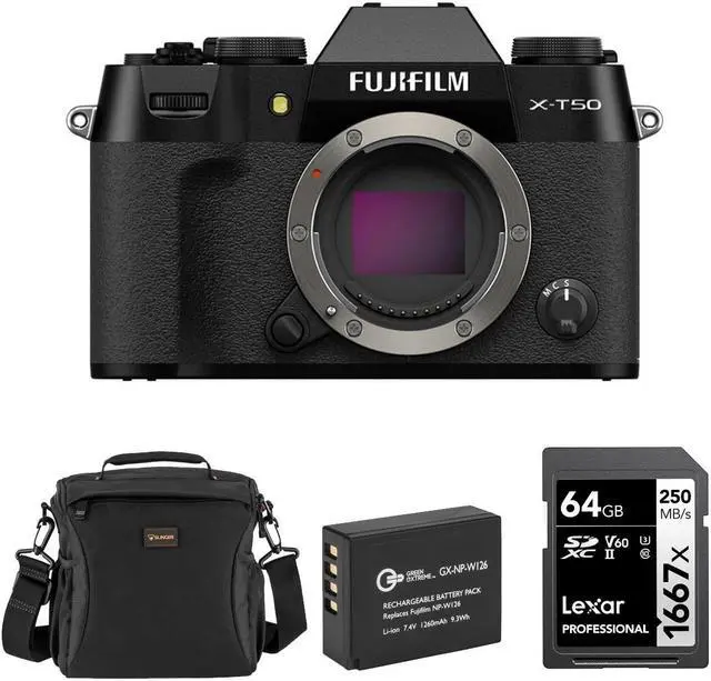 The X-T50's video capabilities are equally impressive, supporting up to 6.2K internal recording at 30p in 4:2: 2 10-bit color, along with 4K/60p and high-speed 1080/240p options for versatile video production. This bundle includes a Li-Ion battery, a 64GB SDXC memory card, and a shoulder bag, ensuring you're ready to capture every moment with ease. Whether you're a seasoned professional or an enthusiastic amateur, the Fujifilm X-T50 Mirrorless Camera is designed to elevate your photography and videography experience.