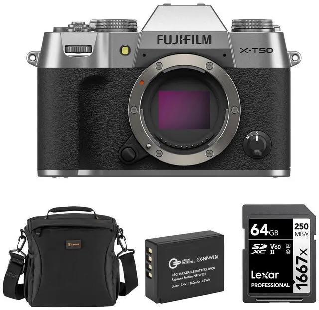 Expand your creative possibilities with the X-T50's unique Film Simulation modes, which replicate classic photographic film stocks. From the neutral tones of PROVIA/STANDARD to the vivid colors of Velvia/VIVID, each mode offers a distinct look to enhance your photographic journey. Additional creative features include Clarity control, Monochromatic Color, Grain Effect, and Color Chrome Effect, allowing you to fine-tune your images to your personal style. The Fujifilm X-T50 also offers advanced video functionality, capable of recording up to 6.2K internally at 30p in 4:2: 2 10-bit color. With options for 4K/60p and high-speed 1080/240p, the X-T50 provides flexibility for capturing stunning video content. In AUTO mode, the camera automatically optimizes exposure settings and subject detection, simplifying the image-making process for both photos and videos. This bundle includes a Li-Ion battery, a 64GB SDXC memory card, and a shoulder bag, ensuring you have everything you need to start capturing your creative vision with the Fujifilm X-T50 Mirrorless Camera.