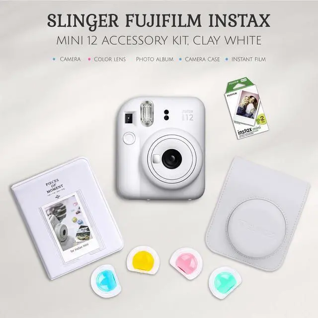 Introducing the Fujifilm Instax Mini 12 Instant Film Camera in Clay White, a delightful bundle that includes essential accessories for an enhanced photography experience. The package encompasses a Hand Strap, 2x AA Batteries, User Manual, and the Slinger Fujifilm Instax Mini 12 Accessory Kit in Clay White. Additionally, enjoy capturing moments with the included Twin Pack of Fujifilm Instax Mini Instant Daylight Film, providing 20 exposures. Capture memories in a tangible form with instant film photos f physical prints that can be held and shared, imparting a unique and nostalgic appeal.