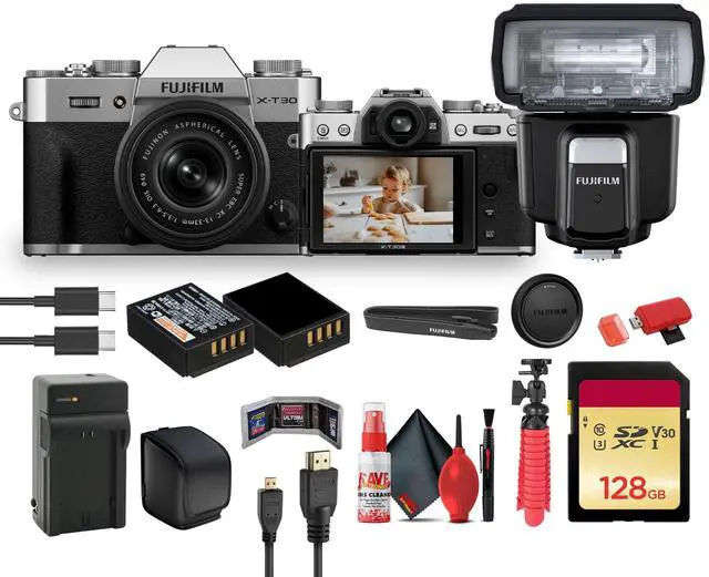 FUJIFILM X-T30 III Mirrorless Camera with 13-33mm f/ 3.5 - 6.3 Lens (Silver) FUJIFILM EF-60 Shoe Mount Flash USB Card Reader SD/microSD 128GB Memory Card BATTERY FOR FUJI NP-W126 CHARGER FOR FUJI NPW126 12 inch FLEXIBLE TRIPOD Memory Card Wallet Hand Strap (SLR/Video) generic USBC-to USBC cable Black 6ft Cleaning Kit Camera Bag Diginerds Micro HDMI Cable - 6 Ft