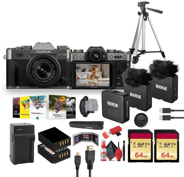 FUJIFILM X-T30 III Mirrorless Camera with 13-33mm f/ 3.5 - 6.3 Lens (Charcoal Silver) RODE Wireless GO (Gen 3) 2-Person Compact Digital Wireless Microphone System/Recorder USB Card Reader SD/microSD 64GB Memory Card BATTERY FOR FUJI NP-W126 CHARGER FOR FUJI NPW126 Tripod 72 INCH Memory Card Wallet Hand Strap (SLR/Video) generic USBC-to USBC cable Black 6ft Cleaning Kit Corel Photo Video & Art Suite Deluxe Camera Bag Diginerds Micro HDMI Cable - 6 Ft