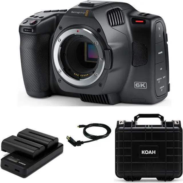 The Blackmagic Pocket Cinema Camera 6K G2 is an advanced technology, handheld 6K digital film camera with 6144 x 3456 Super 35 high-resolution HDR sensor, dual native ISO, EF lens mount, and direct recording to USB-C disks! This powerful model adds an adjustable touchscreen, and a larger battery for longer run time. You can even add an optional OLED viewfinder.KEY_TAB KEY_TAB