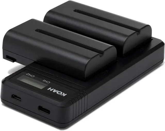 Koah 2-Pack Rechargeable 3350mAh Batteries and Dual USB-C LCD ChargerWith the Koah 2-Pack Rechargeable 3350mAh Batteries and Dual USB-C LCD Charger for Sony NP-F570 you can be sure you always have enough power to make it through the shoot. The Koah rechargeable lithium-ion battery and charger kit includes two batteries for the Sony NP-F570 and one dual Type-C charger with LCD display. The Koah Rechargeable Battery Two-Pack and Charger Kit Compatible with NP-F570 allows you to quickly charge two NP-F570 camera batteries at the same time.