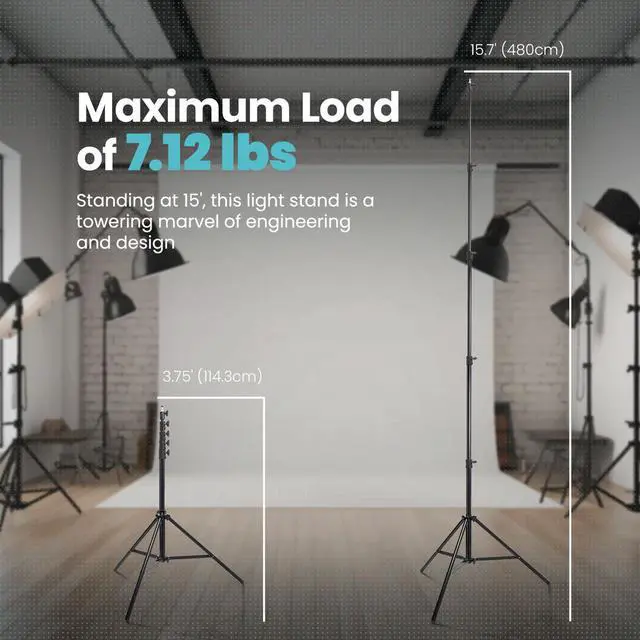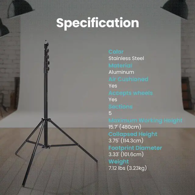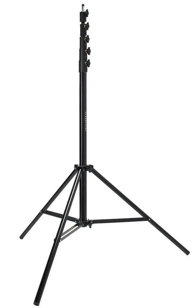 Let the Flashpoint 15.7 ' Pro Air-Cushioned Heavy-Duty Light Stand elevate your photography to new heights. This towering 15.7 ' marvel, cloaked in a sleek black finish, is a testament to superior engineering and innovative design. Constructed entirely from corrosion and moisture-resistant 100% aluminum, this light stand surpasses industry standards for longevity and durability. More than just a light stand, the Flashpoint Pro is your reliable partner in the field, crafted from premium lightweight materials that ensure both durability and adaptability in any photographic scenario. It's a versatile tool for photographers, equipped with a reversible 1/2" or 3/8" screw on a 5/8" stud, facilitating seamless connectivity with a broad spectrum of lighting equipment.
