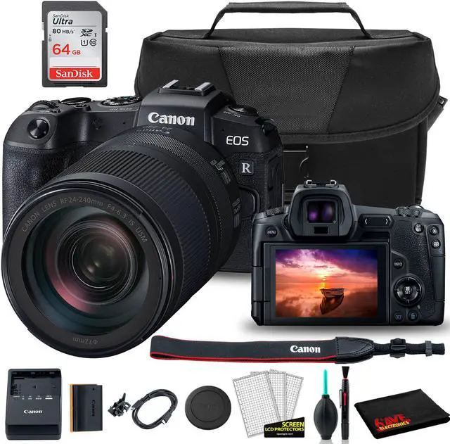 Bundle Includes: Canon EOS RP Mirrorless Digital Camera with 24-240mm Lens (3380C032), EOS Bag, Sandisk Ultra 64GB Card, Clean and Care Kit. 26.2MP Full-Frame CMOS Sensor | DIGIC 8 Image Processor. UHD 4K and Full HD 1080 Video | 2.36m-Dot OLED Electronic Viewfinder. Impressively small despite having a large full-frame sensor, the Canon EOS RP offers flexible imaging capabilities along with a portable form factor.. Featuring a high-resolution 26.2MP full-frame CMOS sensor along with a DIGIC 8 image processor, both stills and UHD 4K video can be recorded using a broad sensitivity range, from ISO 100-40000, to suit working in a variety of lighting conditions.