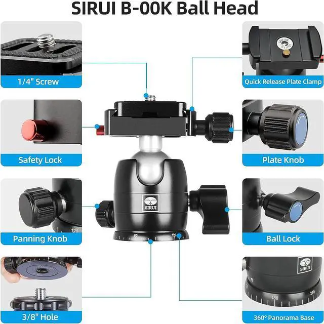 Rock-Steady Ball HeadAlthough lightweight, this ball head has a relatively large size and a strong locking force for secure camera mounting. The base can be smoothly rotated by 360 degrees to capture nice panoramic shots. The ball-shaped design ensures flexible angle adjustment. Vertical shooting is available.D ring for easy screw tightening.