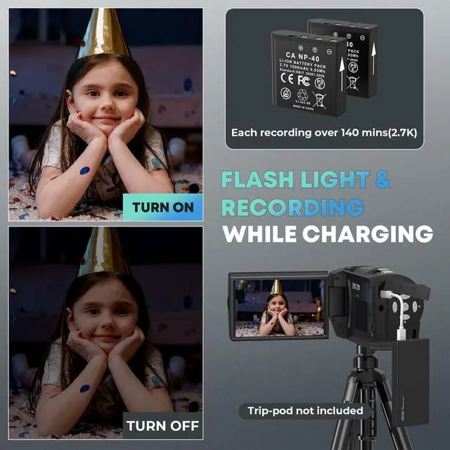 Long-duration & Recording While ChargingThe QHD vlogging camera includes two high-capacity 1500mAh NP-40 lithium batteries, each providing over 140 minutes of continuous recording. It also supports recording while charging, ensuring you won't miss any important moments due to low battery, making it perfect for events like concerts, sports games, and vlogging.