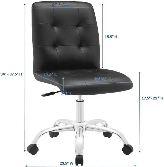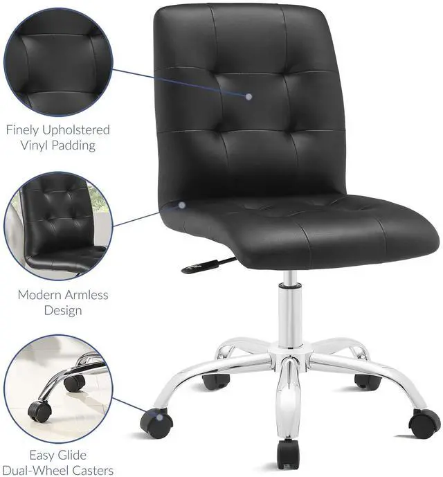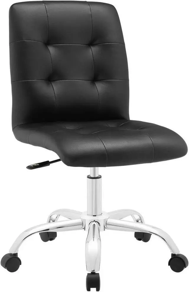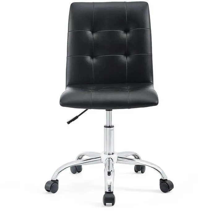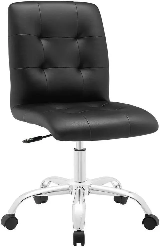 Etiquette presides over the properly styled Prim armless office chair. Modern to the touch, luxurious to the eye, Prim features deep tufted buttons, skilled faux leather upholstery, and elegant trim for added finesse. Prim is height adjustable, swivels to a 360 spin, and comes outfitted with a polished chrome steel base with five dual-wheel nylon casters. Perfect for conference rooms, workstations or desks, Prim is a modern piece that works admirably to further the finer civilities of life.