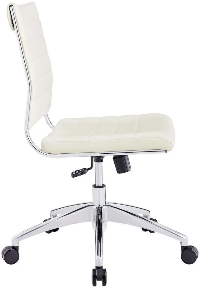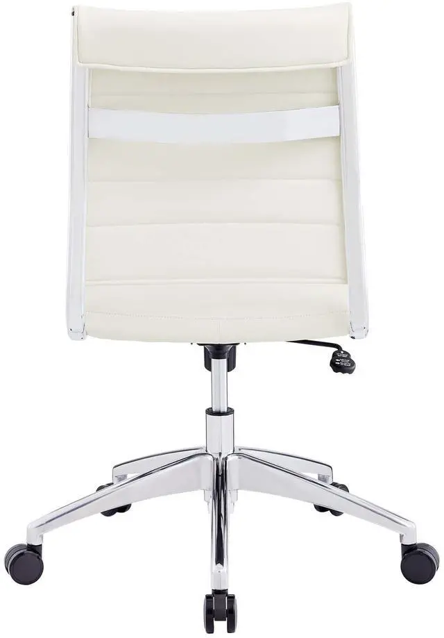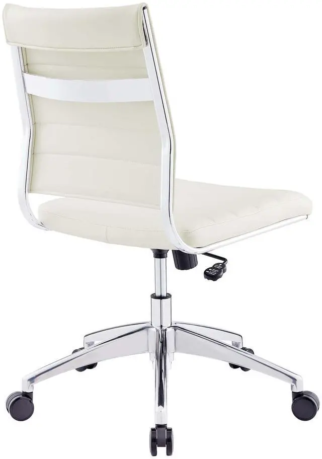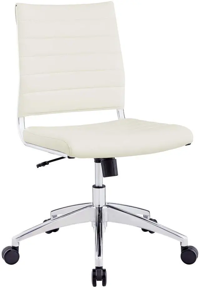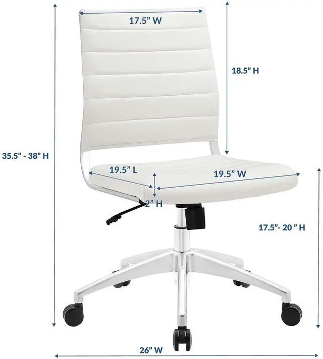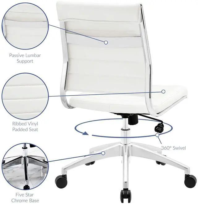 Steer the course and sail to an island called style. Jive is the result of chair makers who decided to design a chair that just works. Functionally, it is a pleasure to sit in as the durable ribbed vinyl back provides natural posture support. The seat cushion comes well padded, while the armless construction makes this a perfect piece for conference rooms and desk work. Jives chrome-plated aluminum base is fitted with five dual-wheel casters, while a tension knob and tilt lock allow for easy back position adjustments. This is a chair made for the modern office and a welcome embodiment of the spirit of progress and determination.