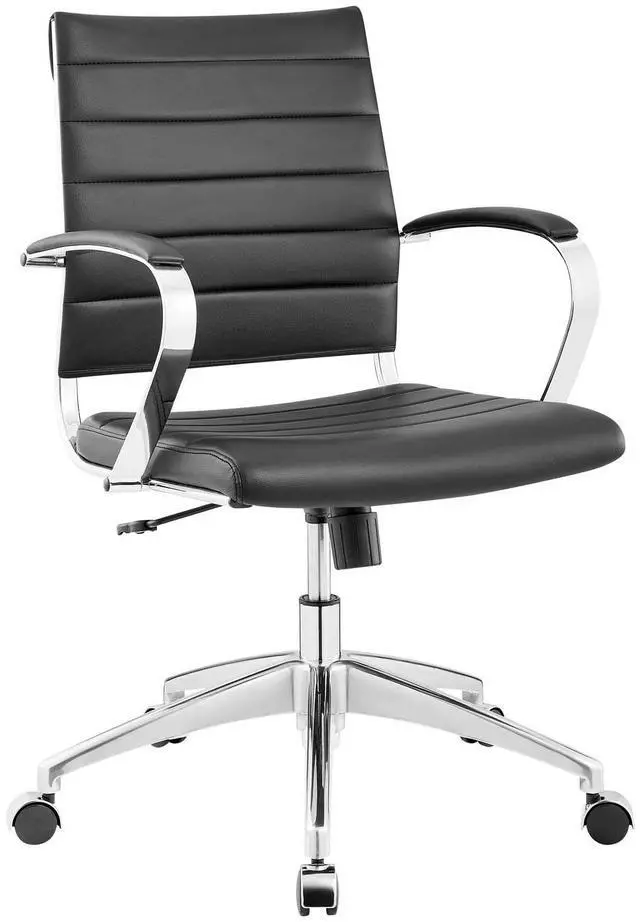 Steer the course and sail to an island called style. Jive is the result of chair makers who decided to design a chair that just works. Functionally, it is a pleasure to sit in as the durable ribbed vinyl back provides natural posture support. The seat cushion and arms are padded, while the form of the armrests was intended to maximize a 90-degree wrist angling for typing. Jives chrome-plated aluminum base is fitted with five dual-wheel casters, while a tension knob and tilt lock allow for easy back position adjustments. This is a chair made for the modern office and a welcome embodiment of the spirit of progress and determination.