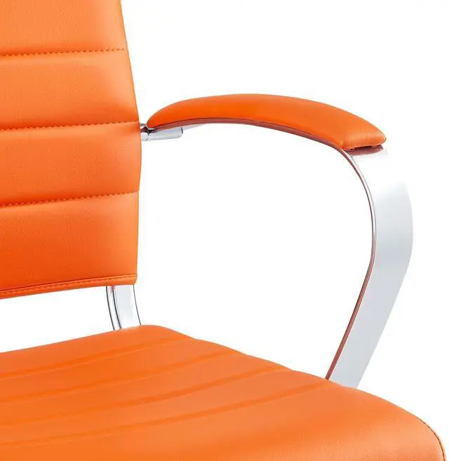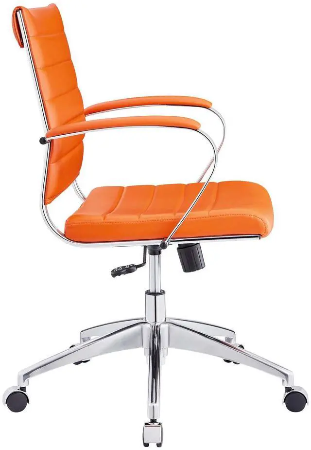 Steer the course and sail to an island called style. Jive is the result of chair makers who decided to design a chair that just works. Functionally, it is a pleasure to sit in as the durable ribbed vinyl back provides natural posture support. The seat cushion and arms are padded, while the form of the armrests was intended to maximize a 90-degree wrist angling for typing. Jives chrome-plated aluminum base is fitted with five dual-wheel casters, while a tension knob and tilt lock allow for easy back position adjustments. This is a chair made for the modern office and a welcome embodiment of the spirit of progress and determination.