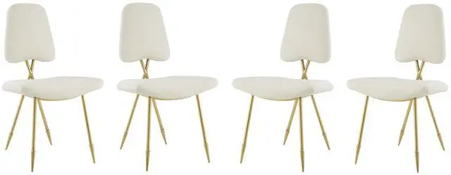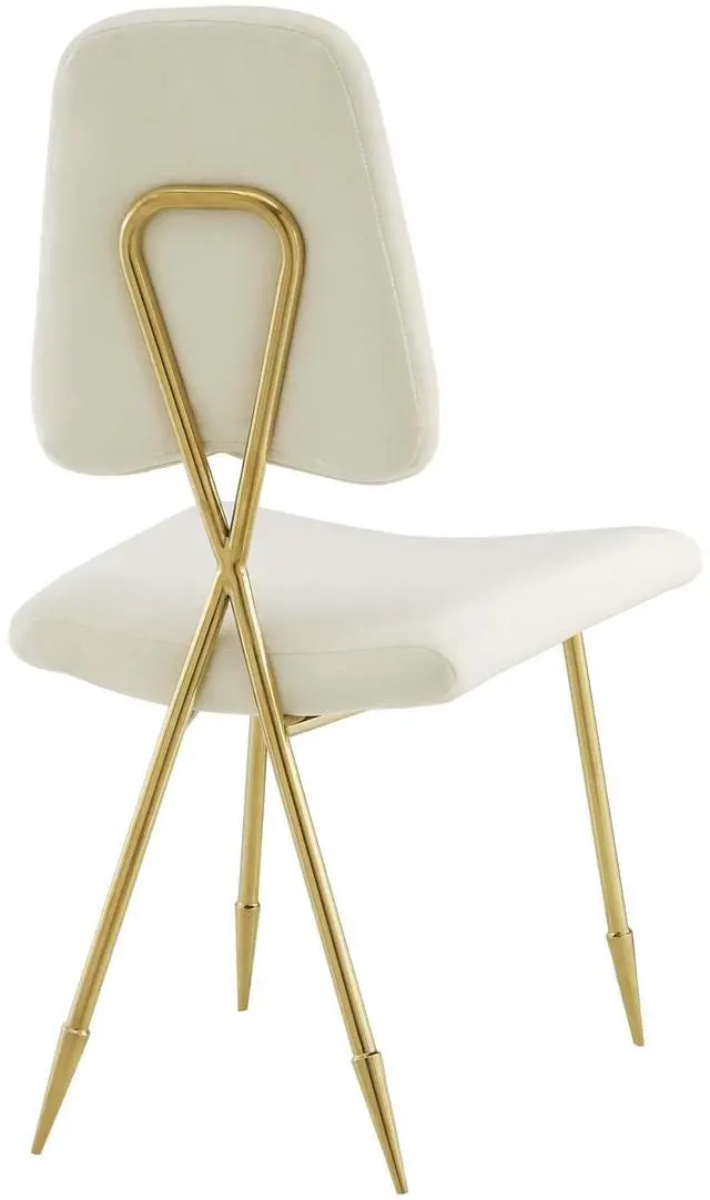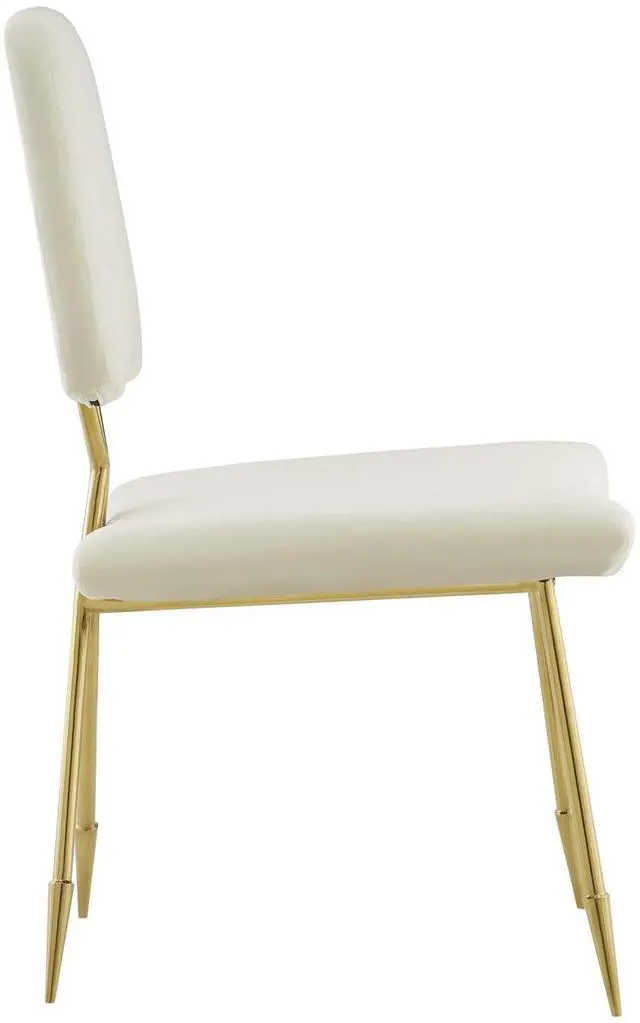Survey your surroundings with confidence with the Ponder Dining Side Chair. Ponders padded high-density foam seat gently slopes upward providing embracing comfort while the tapered back provides ergonomic support. Finely upholstered in luxuriously soft velvet, and supported by a sturdy gold stainless steel frame with four angled mid-century toothpick legs, Ponder makes a striking statement. Accentuate your modern decor with a contemporary side chair that elevates any empty area of your home.