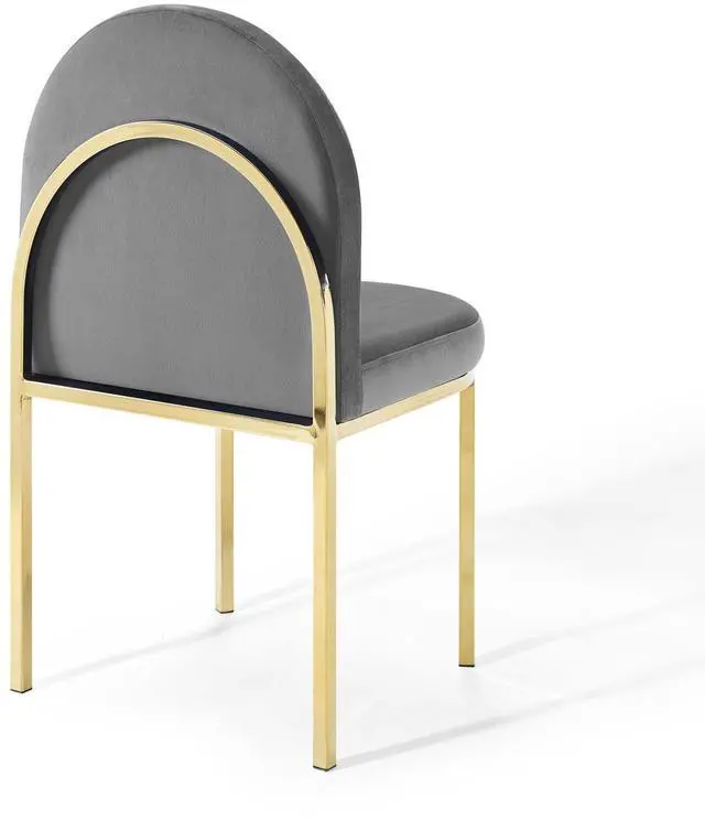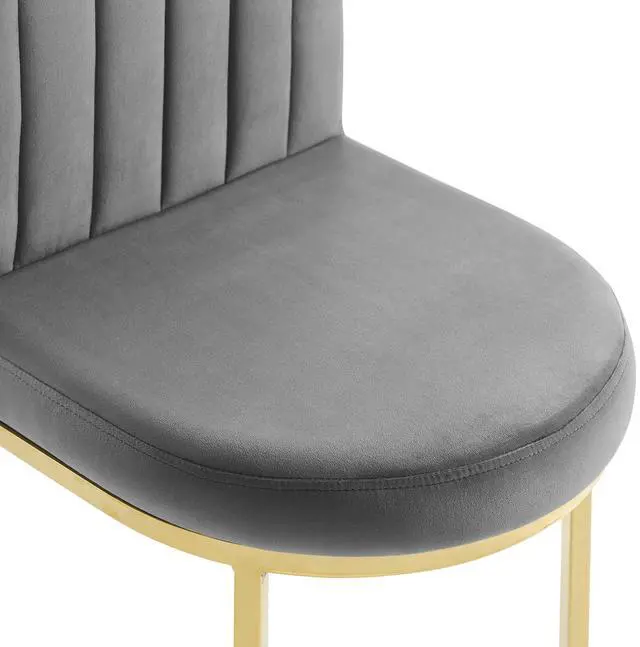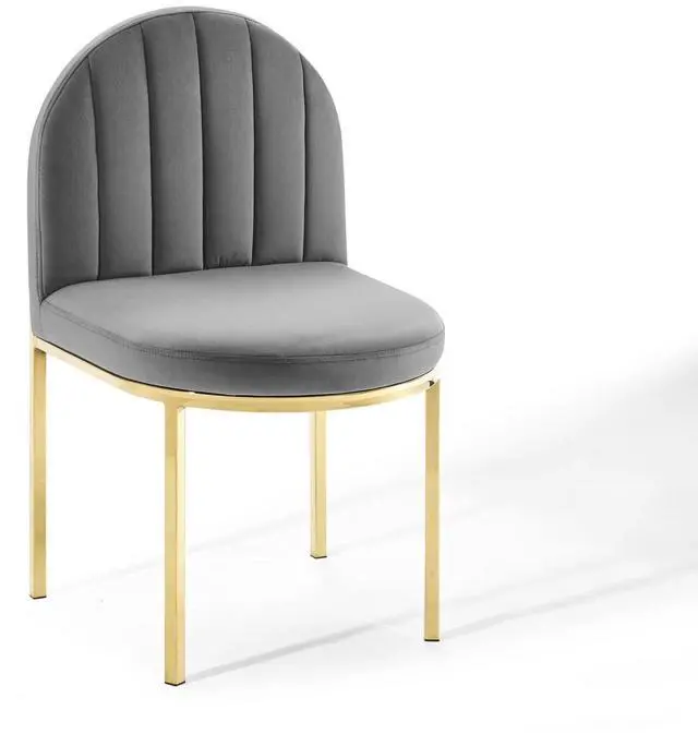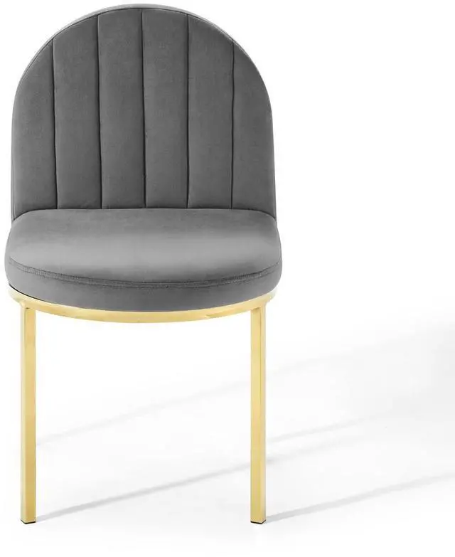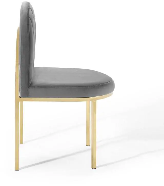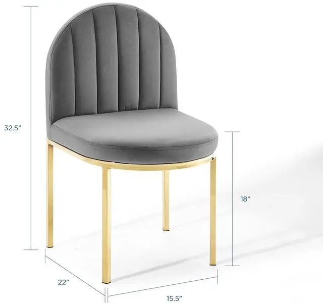 Reinvent your dining room decor with the vintage glamour of the Isla Channel Tufted Performance Velvet Upholstered Dining Room Side Chair. Featuring a vintage clamshell design and the bold lines of channel tufted accents, the Isla Dining Accent Chair is a piece to be remarked upon by guests and friends. Dense foam padding provides a comfortable seat, while soft and stain-resistant performance velvet polyester upholstery creates a luxe elegance for long-lasting use. The curved gold stainless steel frame on the Isla Side Chair has four legs with non-marking foot caps to protect flooring.