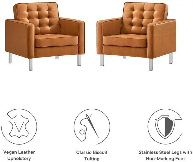 2. Adding visual depth to your living room or lounge space, Loft features soft and durable vegan leather upholstery accented with classic biscuit tufting. This modern accent chair set showcases a captivating linear design, tubular stainless steel legs, and non-marking foot caps that protect flooring. Inspired by the richness of mid-century modern style, these upholstered chairs are an ideal choice for living rooms, office reception areas, and lounge spaces.