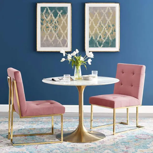 Maximize your dining room decor with Privy Dining Chair Set of 2. A glam deco dining chair, Privy features soft and stain-resistant performance velvet upholstery for a streamlined modern look. This modern dining chair rests atop a sleek gold stainless steel geometric base that will elevate your dining experience. No assembly required.
