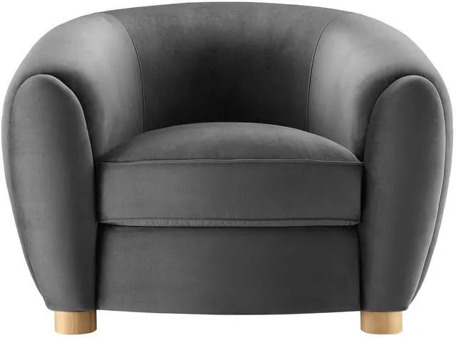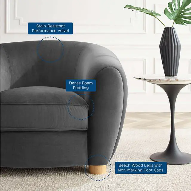 Transport yourself to the comfort of the clouds with the Abundant Performance Velvet Accent Armchair. Bringing glam deco style to a contemporary modern design, this velvet chair boasts organic lines, French piping detail, and a plush, overstuffed silhouette that's made for lounging. Upholstered in stain-resistant performance velvet, this armchair is padded in dense foam for a premium seating experience. Resting atop round beech wood legs with non-marking foot caps to protect flooring, this accent chair makes a bold statement in the living room, home office, lounge space, or bedroom sitting area.