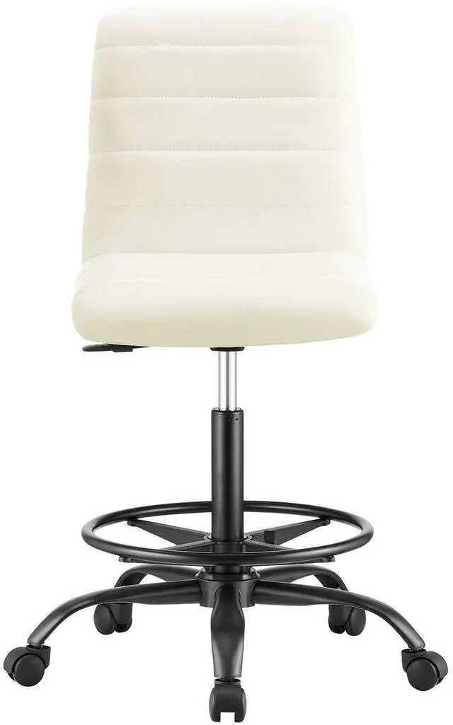Focus on the task at hand while bringing modern style to your workspace with the Ripple Armless Drafting Chair. Outfitted with a matte black frame and five dual-wheel casters for easy mobility over hardwood or carpeted surfaces, this padded drafting stool is upholstered in durable vegan leather and covered in dense foam for added comfort. An ergonomic choice for workstations, this vegan leather drafting-height office chair features a mid-back design, channel tufting, and fine stitching throughout. This drafting chair is fully height adjustable with a 360-degree swivel and its drafting-height makes it suitable for standing desks, drafting tables, reception desks, and more.