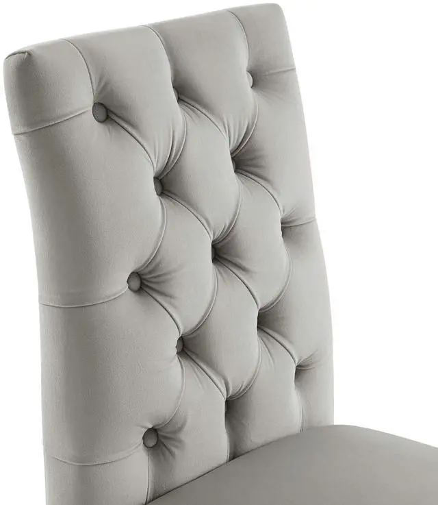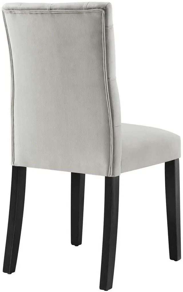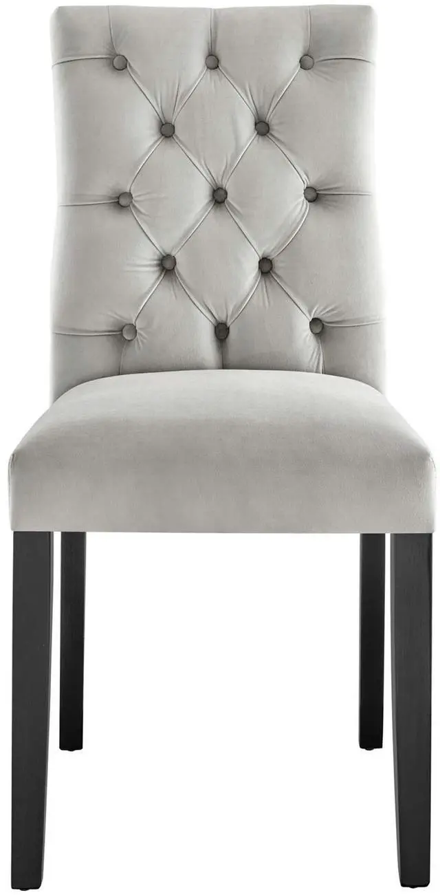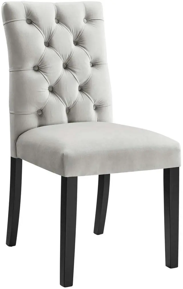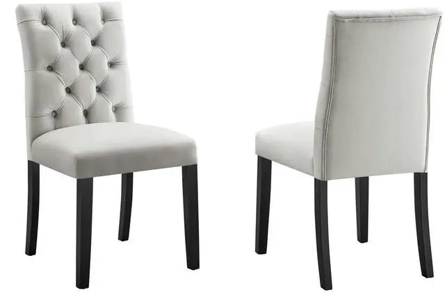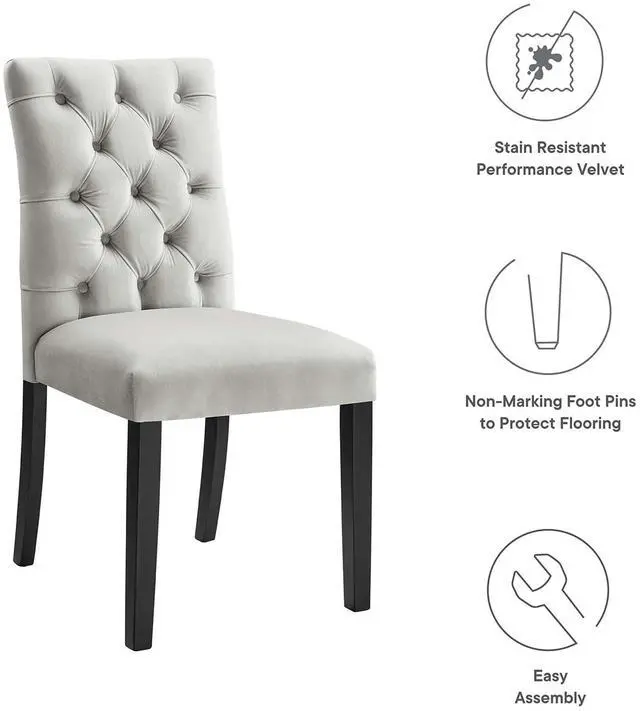 Bestow elegance with the Duchess Dining Chairs - Set of 2. Chic and luxurious, these dining chairs feature a stylish curvy form, richly tufted button back, stain-resistant performance velvet upholstery, and wood legs topped with non-marking foot caps. Dense foam padding and a sinuous spring support system grant a premium seating experience. Resonate grace and charm with a dining chair set perfect for the modern home.