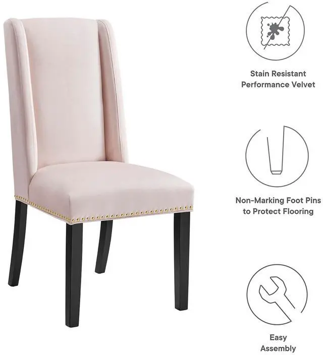Explore the vast riches of a treasured heritage with the Baron Dining Chairs - Set of 2. Designed to resonate elegance, Barons features a charming back and polished nailhead trimmed seat with a dash of grace and noble appeal. Dense foam padding and a sinuous spring support system grant a premium seating experience. Complete with stain-resistant performance velvet upholstery, solid wood frame and legs with non-marking foot glides, Baron is a stylish dining chair set perfect for the modern home.